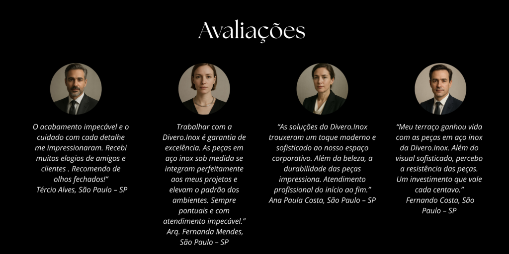 Na Divero.Inox, especializamos em criar soluções em aço inox sob medida que elevam a estética e a funcionalidade de projetos sofisticados. Nosso compromisso é oferecer produtos de alta qualidade, tecnologia avançada e um acabamento impecável, garantindo a exclusividade e durabilidade que seu projeto merece. Conecte-se conosco para transformar seu ambiente com o melhor design em inox de luxo.